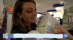 La signora Genny, accompagnata dalla presentatrice, fa il suo shopping in un negozio specializzato, dove ovunque sono in mostra prodotti per l’alimentazione infantile che dovrebbero essere inutili e che, secondo il Codice, non dovrebbero essere promossi.
